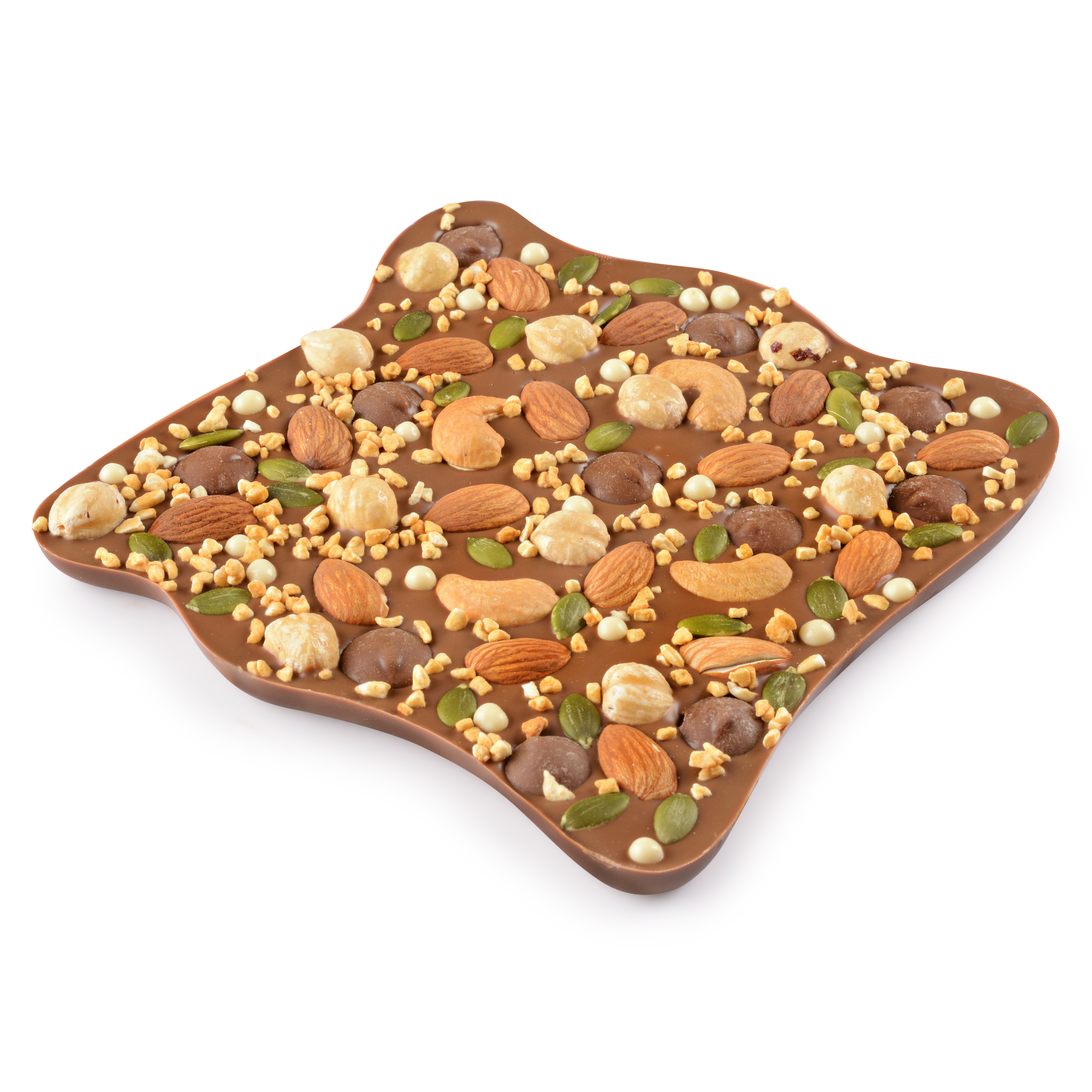 Состав: молочный шоколад (сахар, масло какао, цельное сухое молоко, какао тертое, эмульгатор: соевый лецитин, натуральный ароматизатор ванильный), миндаль обжаренный, фундук обжаренный, кешью обжаренный, семена тыквы обжаренные, воздушный рис в карамели, воздушный рис в белом шоколаде.