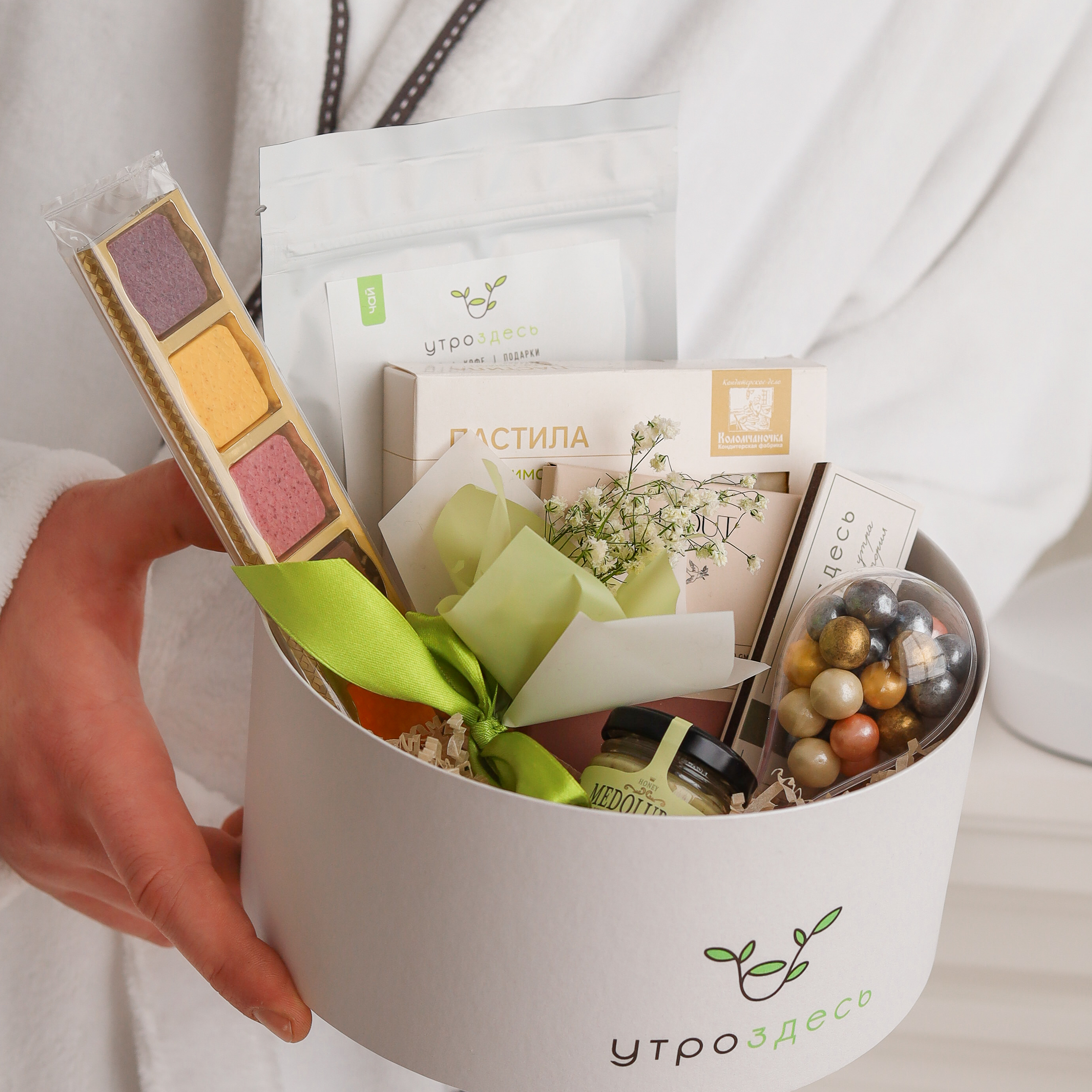Минималистичный дизайн и благородный белоснежный цвет подойдут под любой состав подарка.
