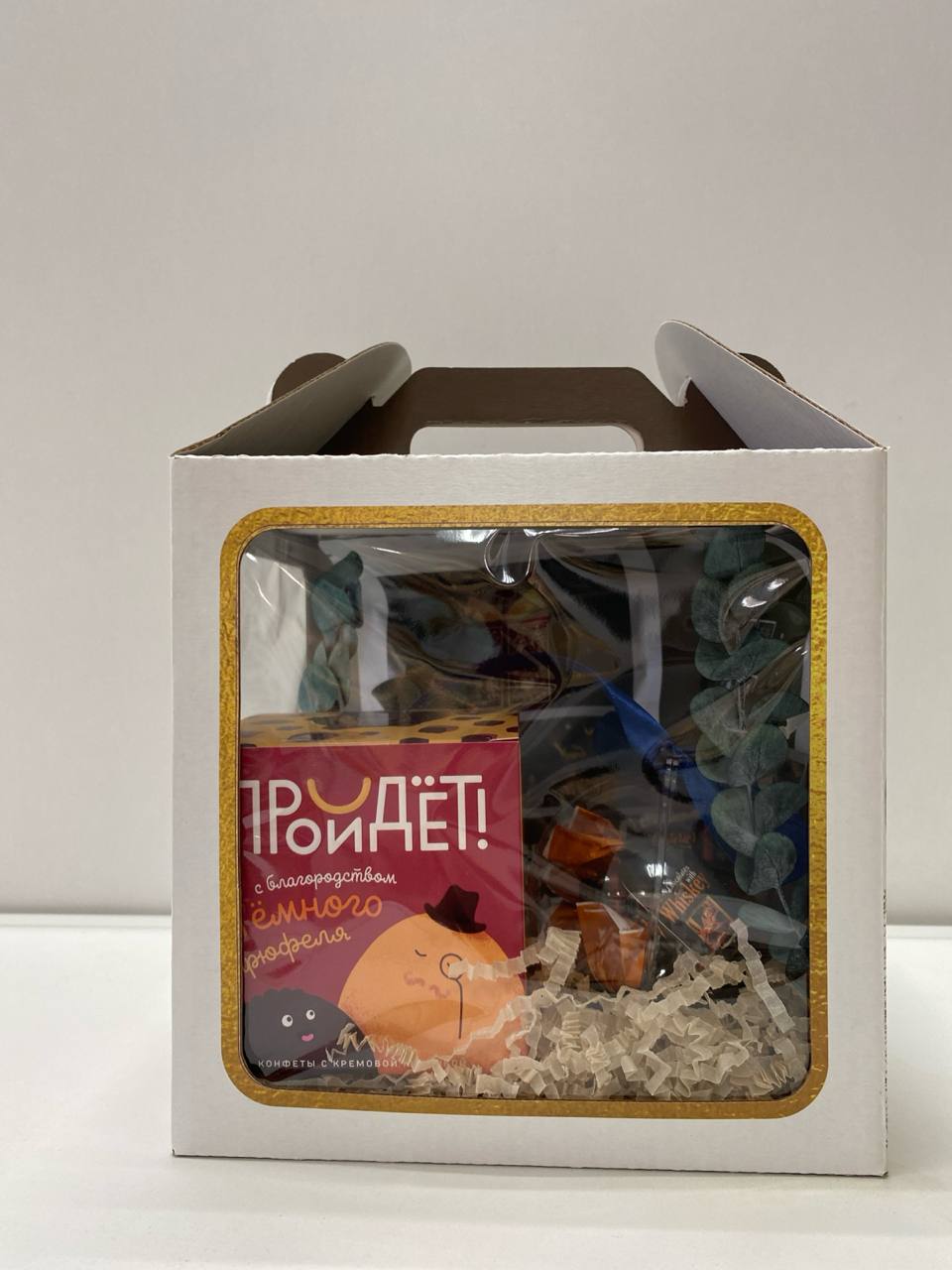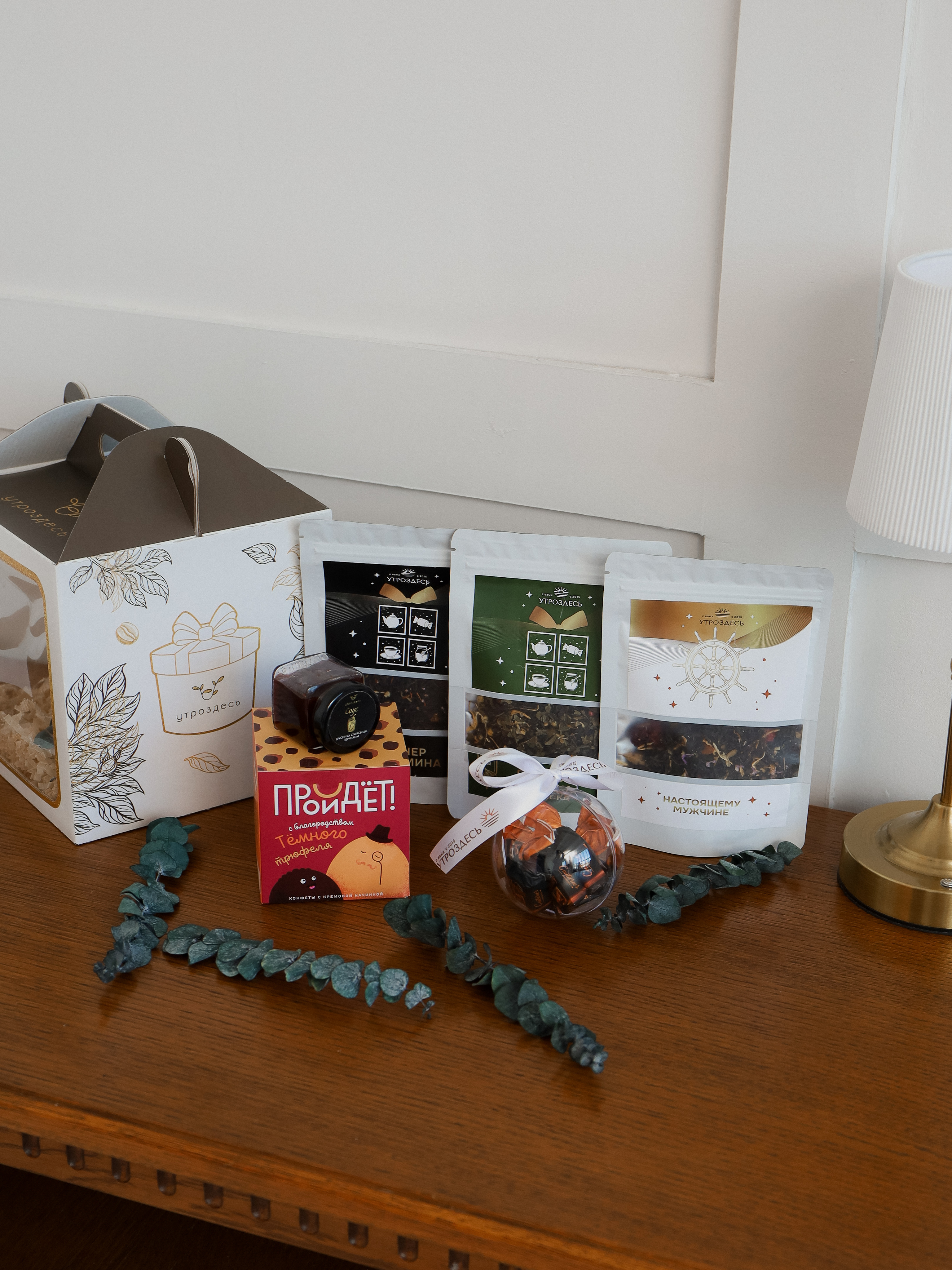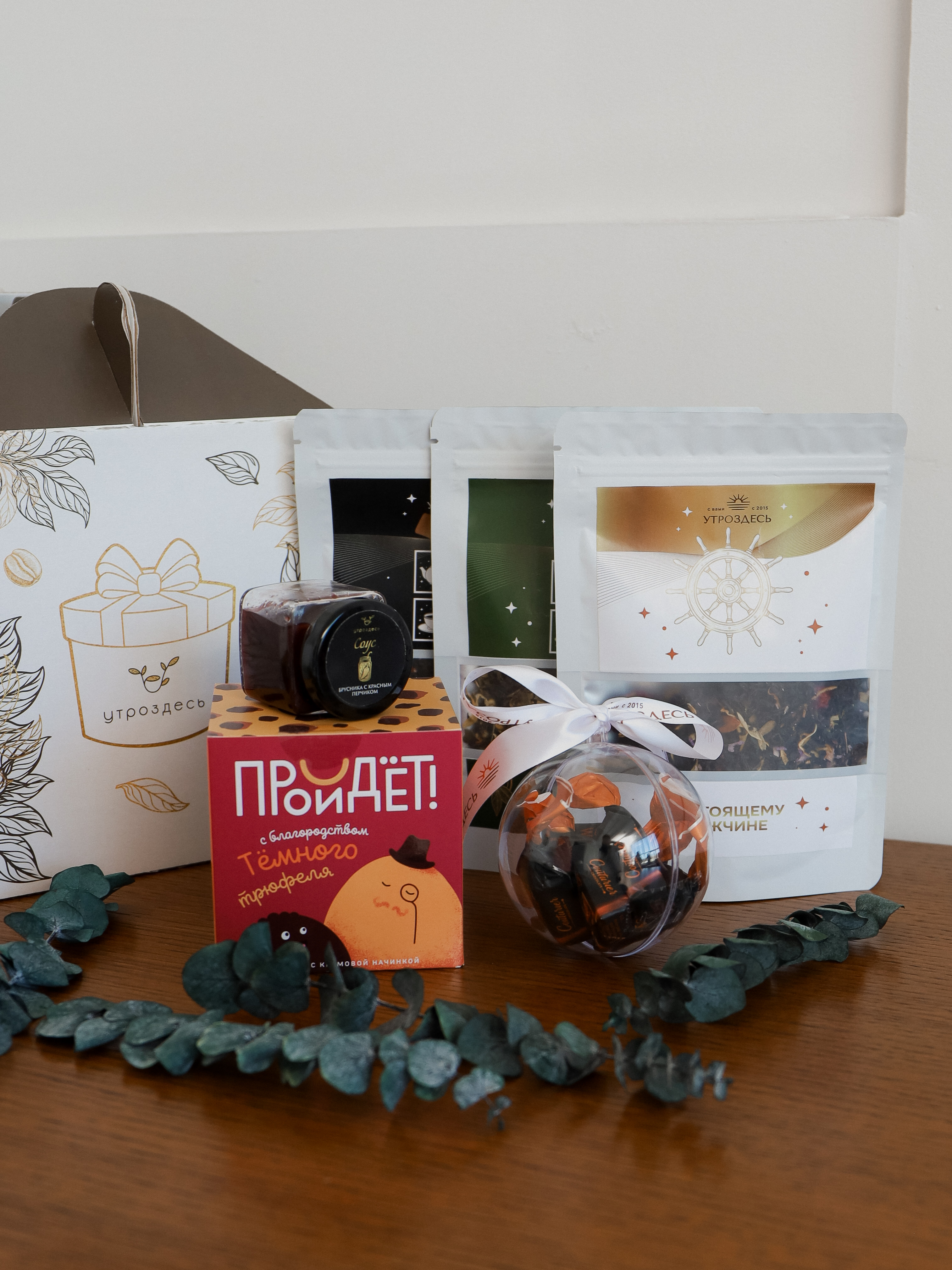 Подарок для вечеров, когда хочется собраться вместе. Ассорти чая сочетается с премиальными конфетами и брусничным соусом с пряной нотой. Дизайнерская упаковка с окнами и декоративные детали создают особенное настроение уютных посиделок.