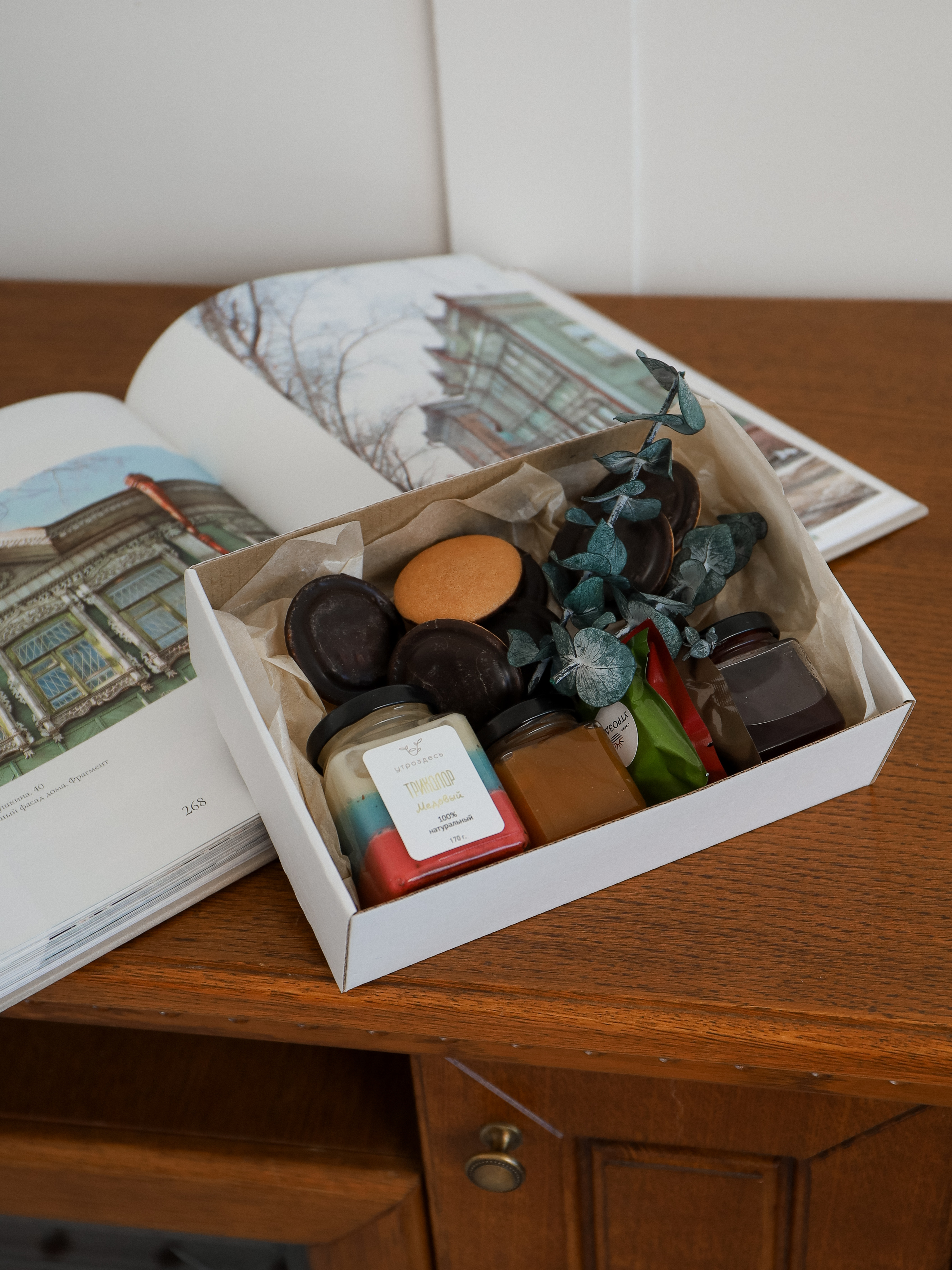Яркий и сбалансированный набор с любимыми вкусами. Мёд-суфле «Триколор», конфитюр манго–лайм, ароматный чай в ассортименте и бисквитное пирожное с джемом создают разнообразное и гармоничное сочетание. Подарок, в котором каждый элемент дополняет другой, вкусно и уместно.