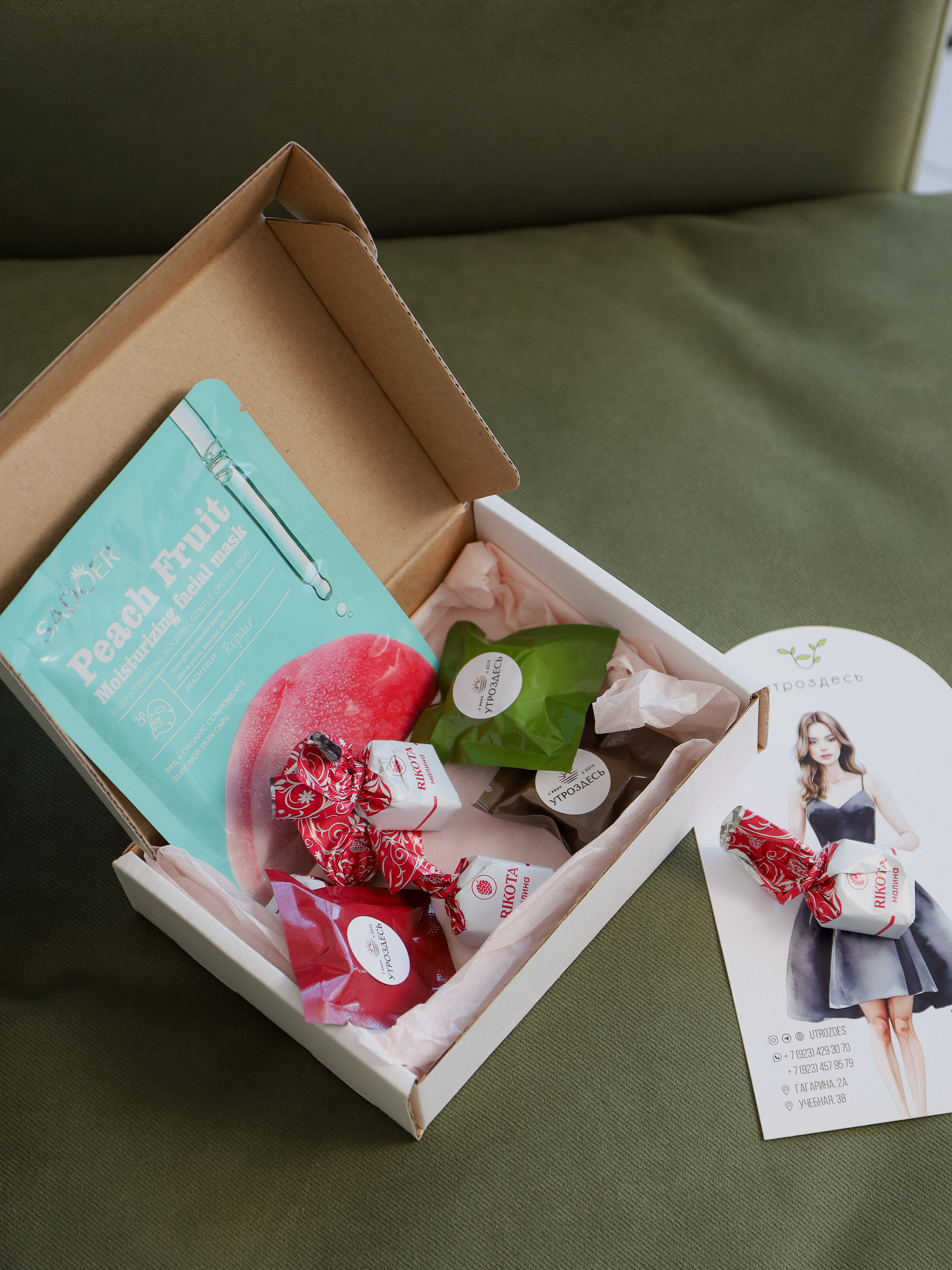 Состав подарка: подарочная упаковка, ароматный мини-чай 3 шт., тканевая маска для лица, эксклюзивные конфеты rikota с малиной.