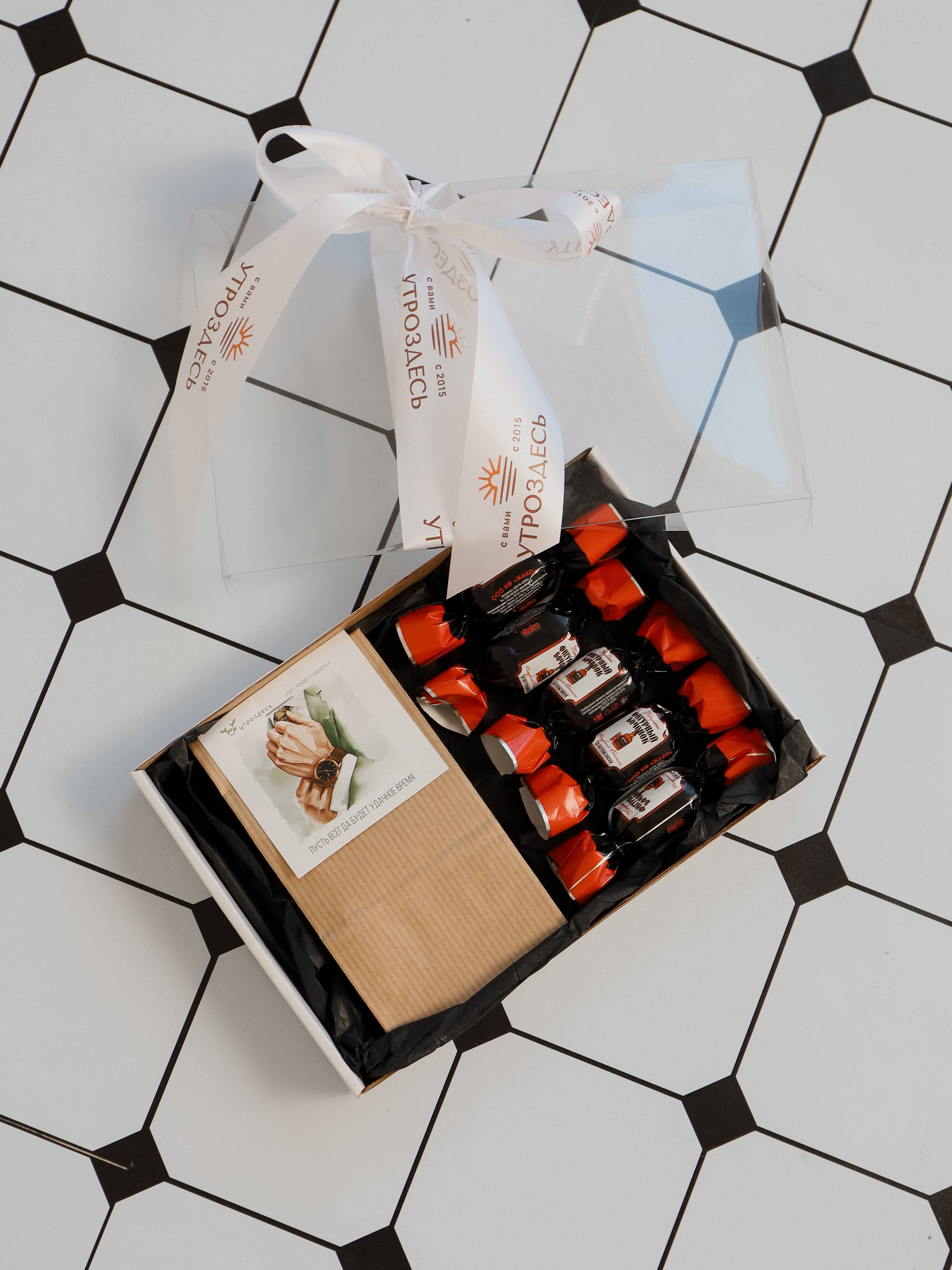 Состав подарка: подарочная упаковка, ароматный чай, эксклюзивные конфеты фигурный бочонок со вкусом виски.