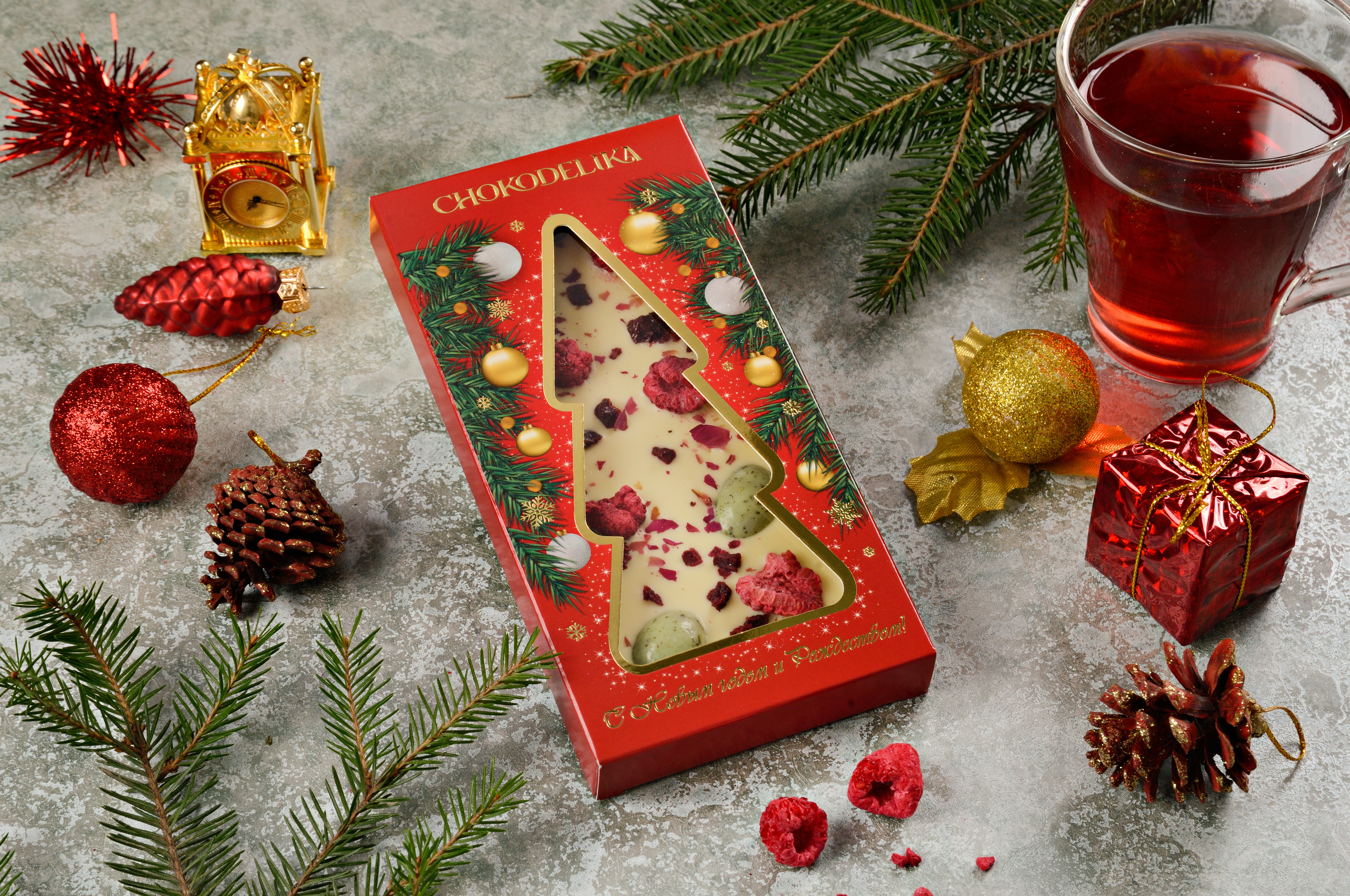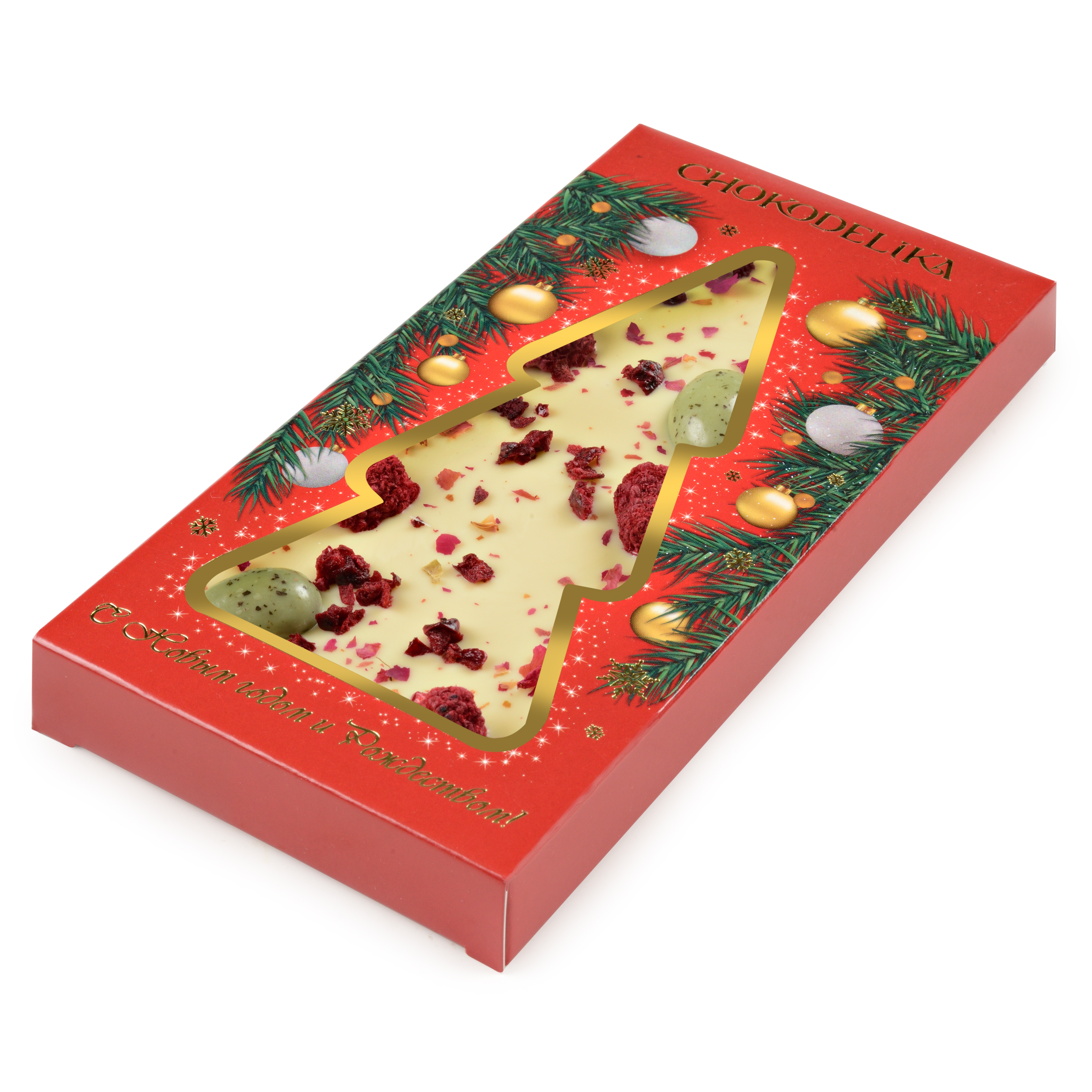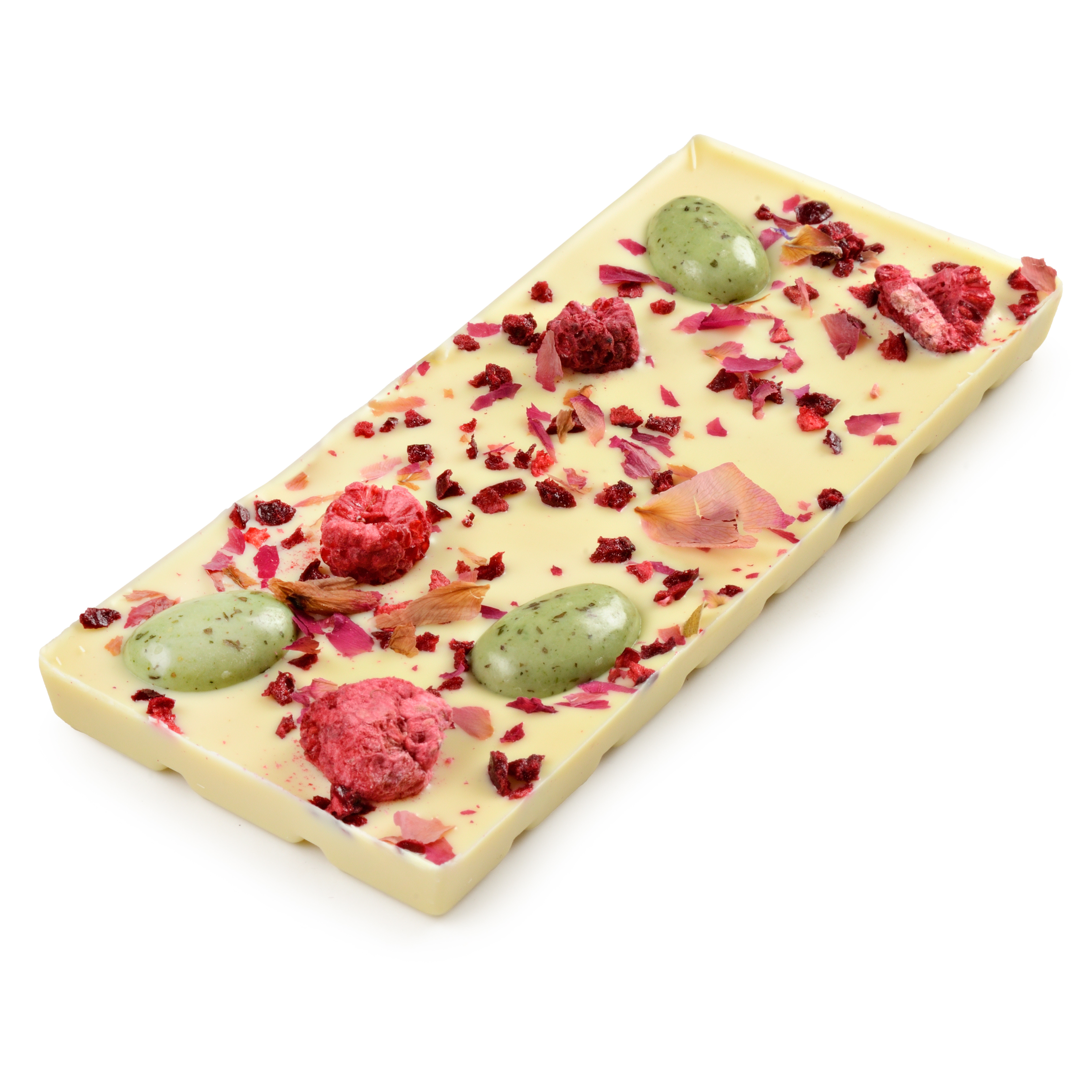 Состав: шоколад белый (сахар, масло какао, цельное сухое молоко, эмульгатор: соевый лецитин, натуральный ароматизатор ванильный), драже «Миндаль с мятой» (белый шоколад (сахар, масло какао, цельное сухое молоко, эмульгатор: соевый лецитин, натуральный ароматизатор ванильный), шоколад темный (какао тертое, сахар, масло какао, эмульгатор: соевый лецитин, натуральный ароматизатор ванильный)), миндаль обжаренный, комплексная пищевая добавка: глазирователь «Квик Шайн» (глюкозный сироп, вода, стабилизатор: гуммиарабик, растительный жир, регулятор кислотности: лимонная кислота, консервант: сорбат калия, мята сушеная, шпинат сушеный, ароматизатор натуральный: эфирное масло мяты), малина сушеная, вишня кусочки сушеная, лепестки розы сушеные.