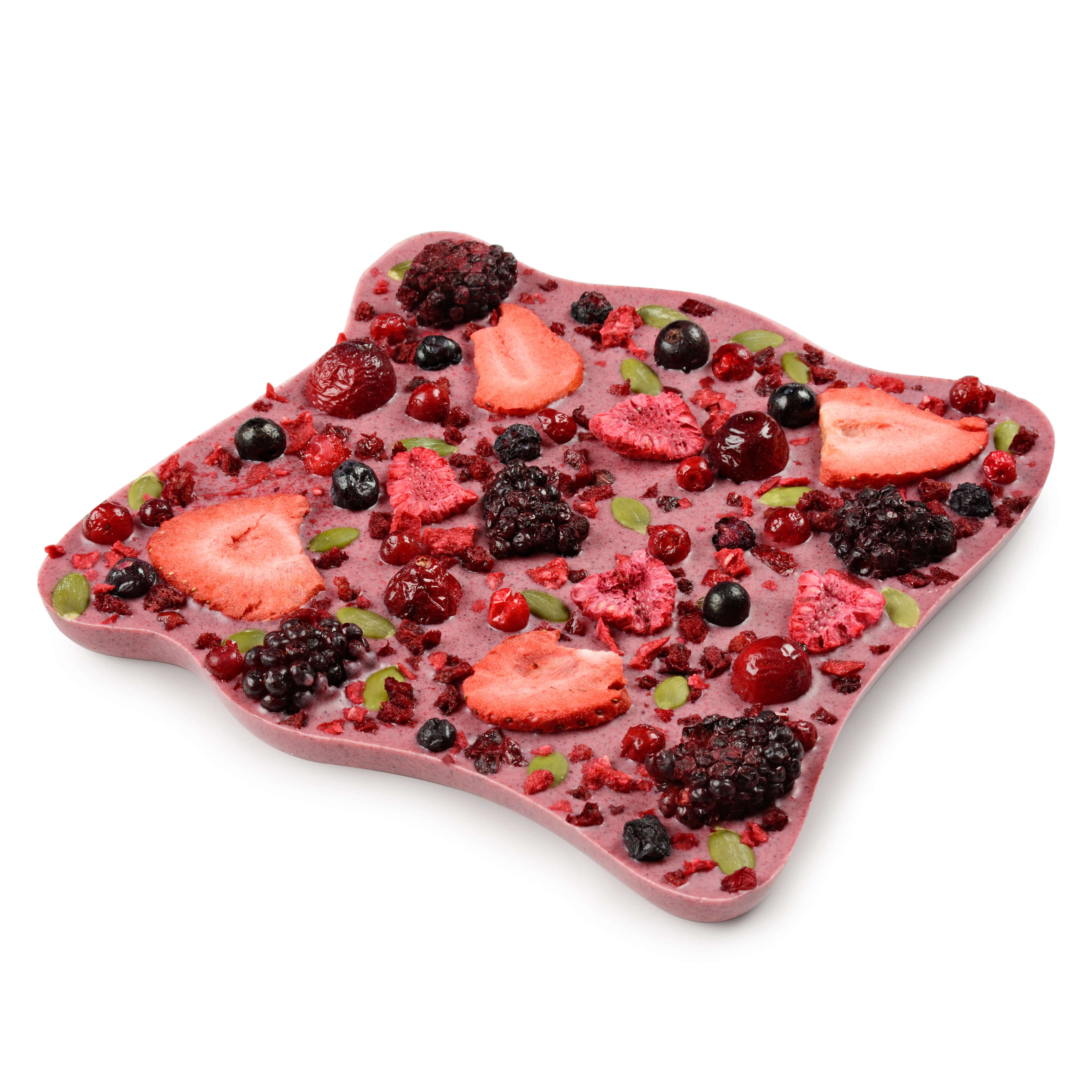 Состав: шоколад белый (сахар, масло какао, цельное сухое молоко, эмульгатор: соевый лецитин, натуральный ароматизатор ванильный), ягоды сушеные (клубника, ежевика, клюква, малина, вишня, черная смородина, черника, брусника), семена тыквы обжаренные, экстракт свеклы сухой.