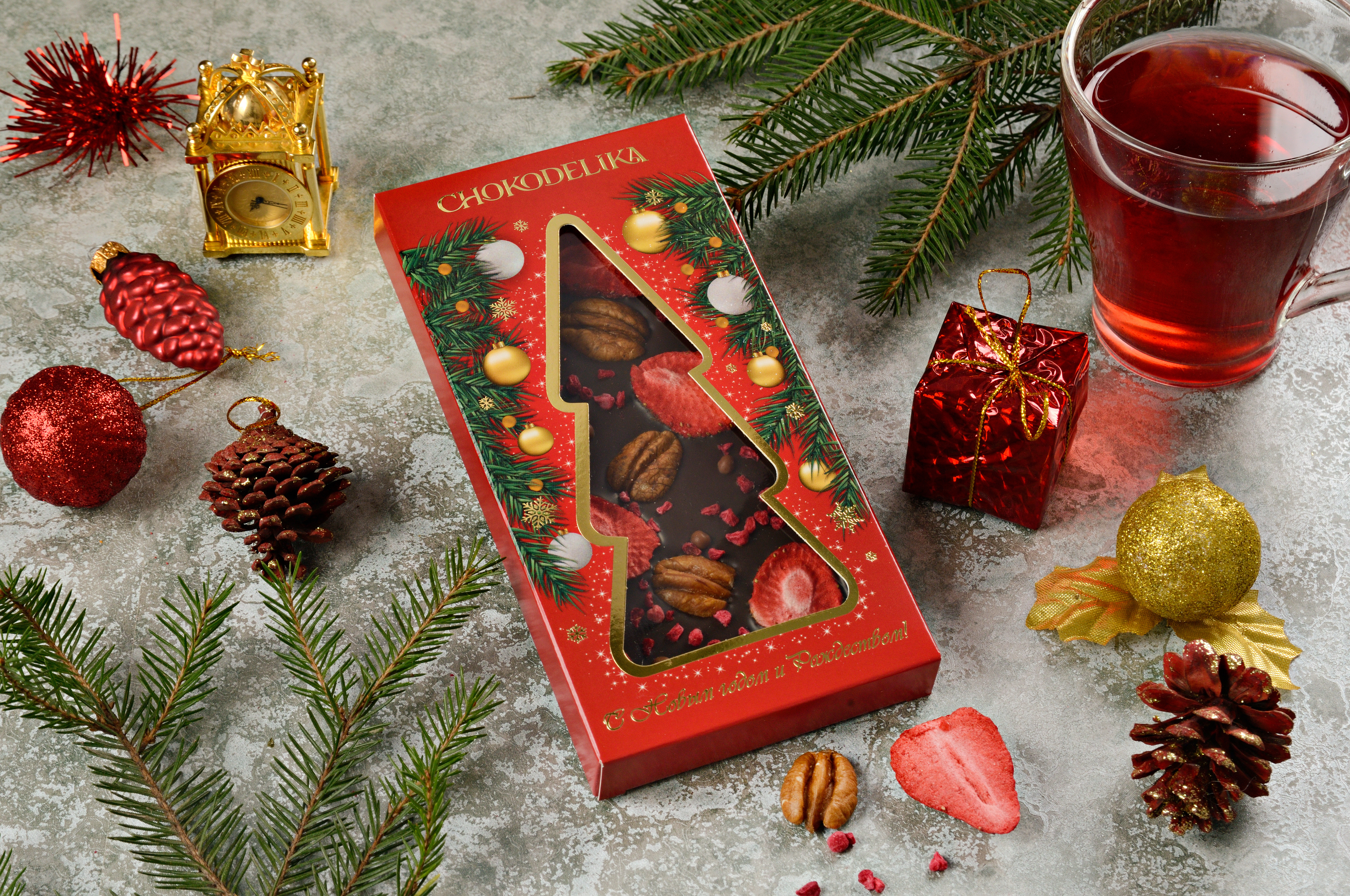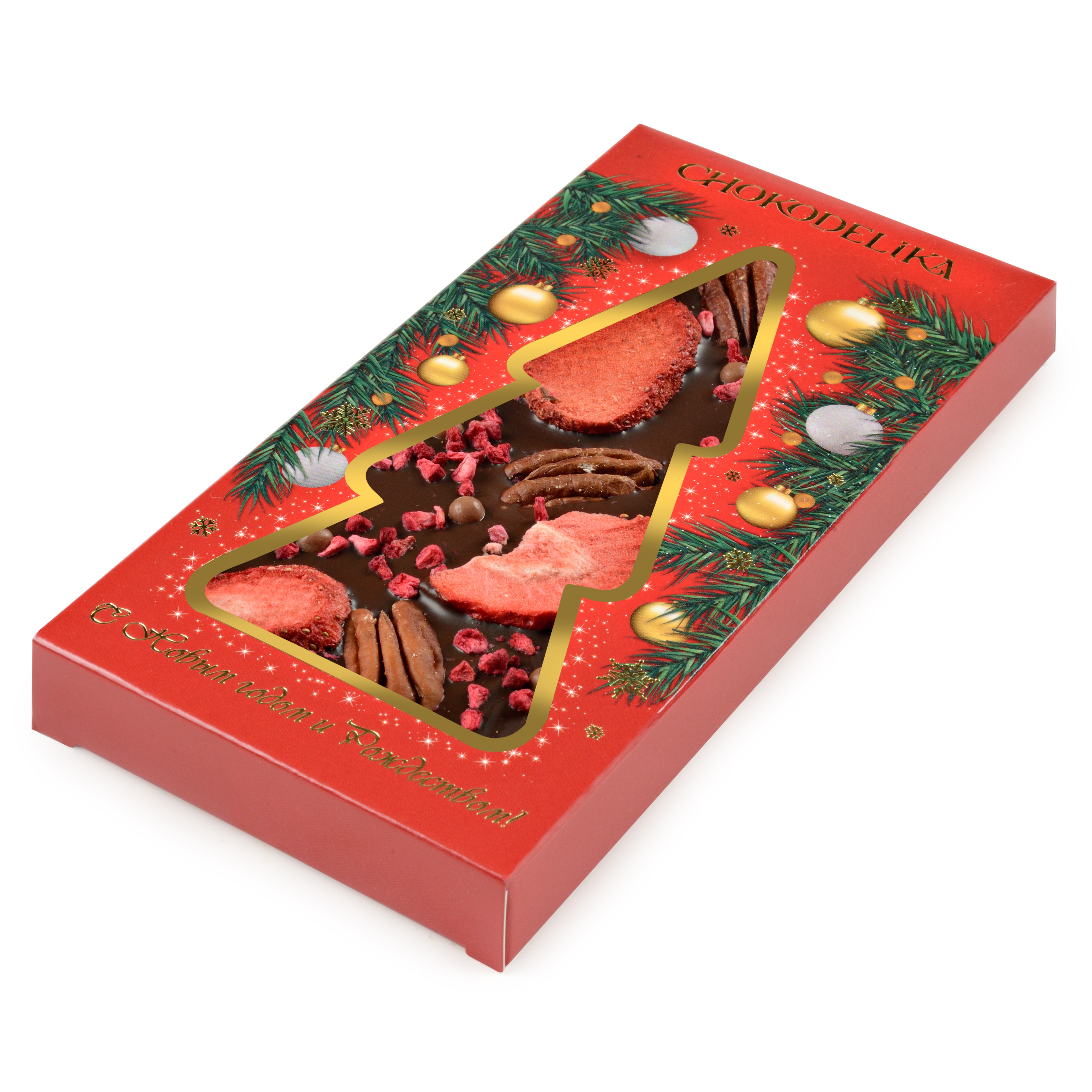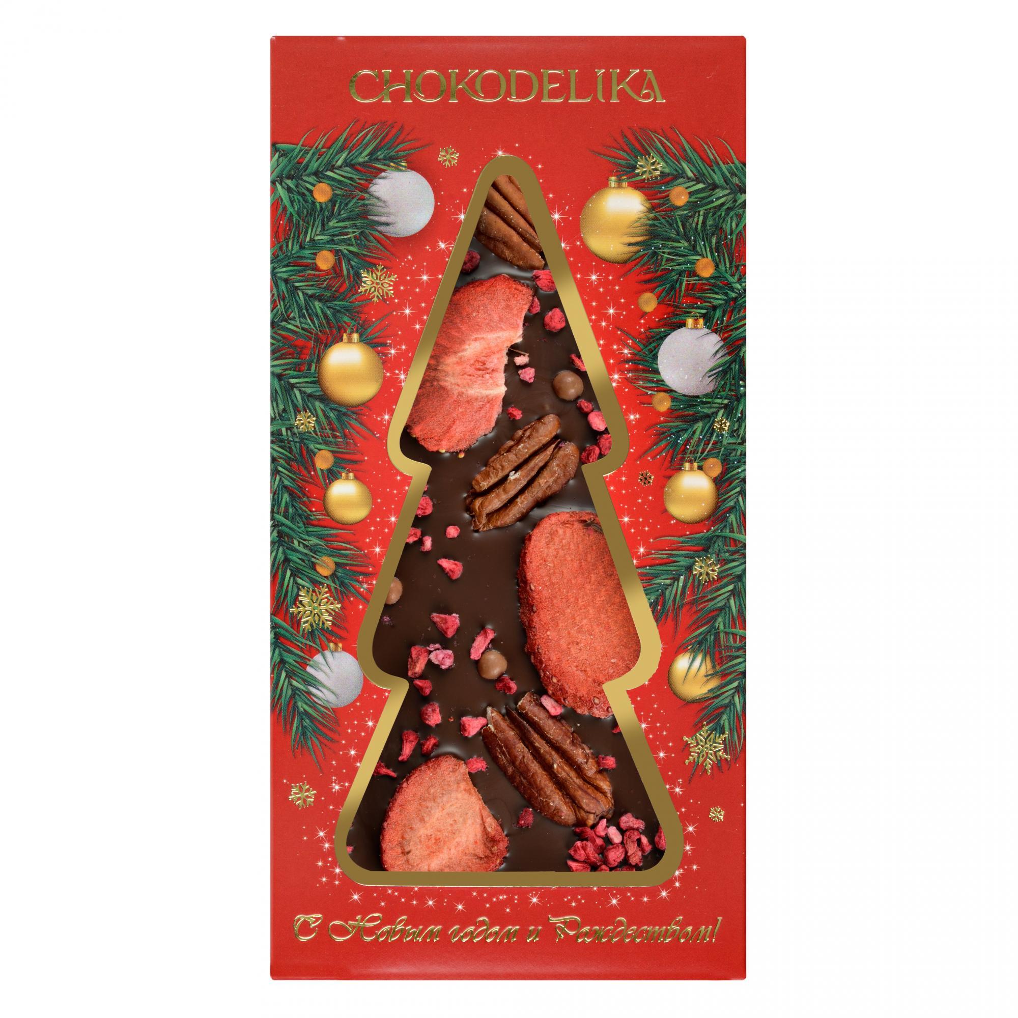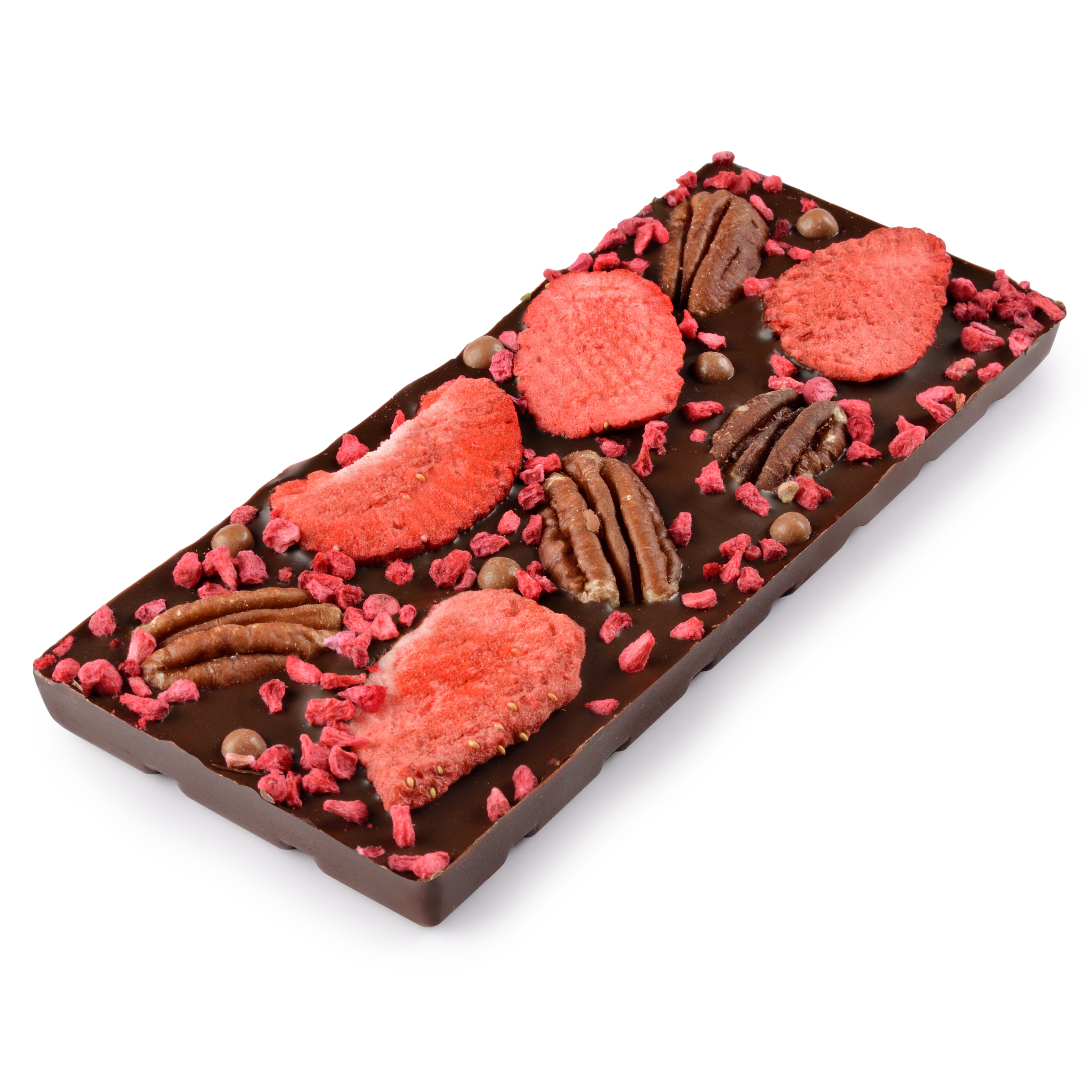 Темный шоколад с украшением "Клубника, Пекан, Малина" — это сто грамм настоящего буйства вкуса! Отборный пекан в сочетании с сублимированными ягодами клубники и малины и темный шоколад высочайшего качества подарят минуты наслаждения. А в сочетании с чашечкой ароматного кофе или чая время, проведенное за угощением, станет незабываемым.