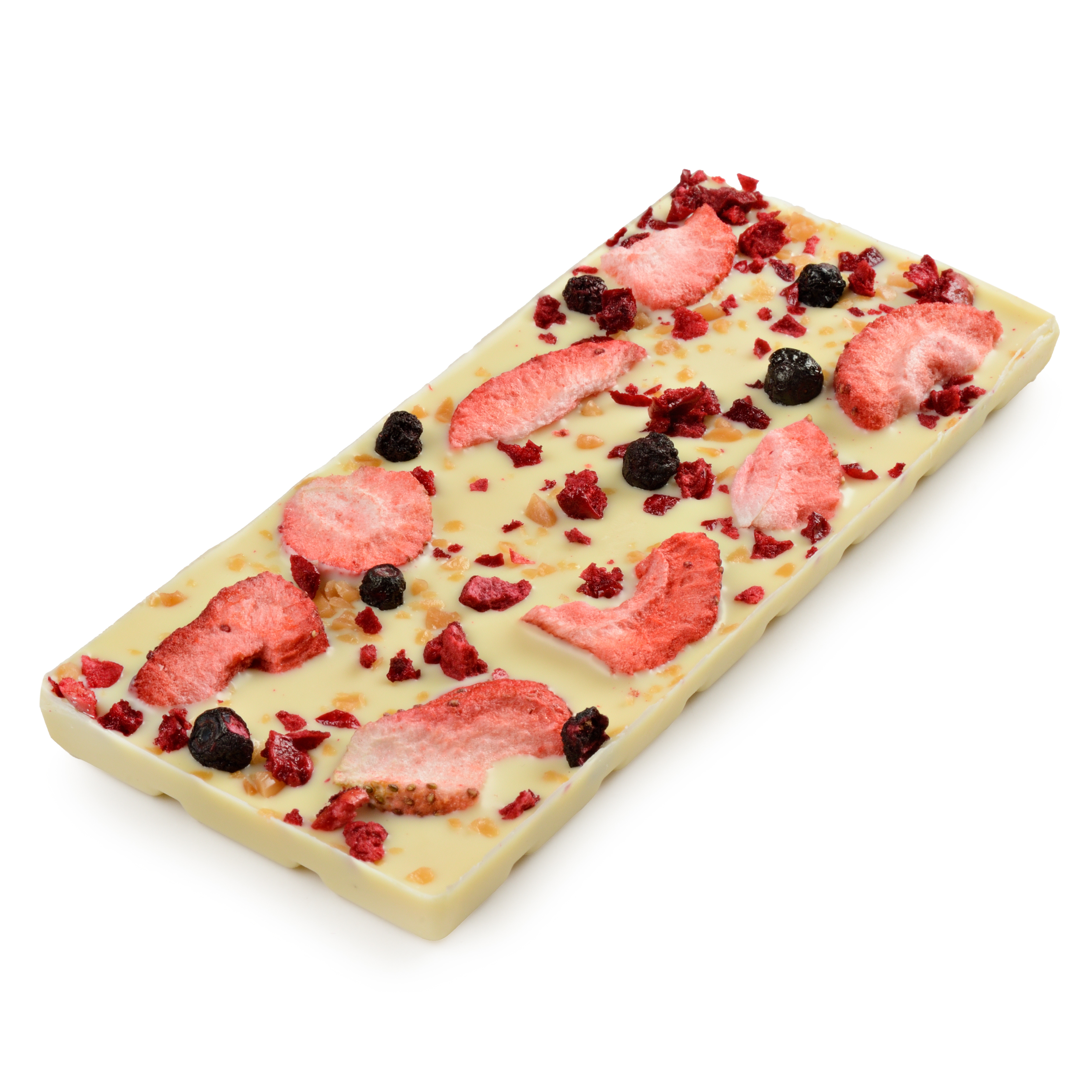 Состав: белый шоколад, клубника сушеная, вишня сушеная, черника сушеная, карамель леденцовая.