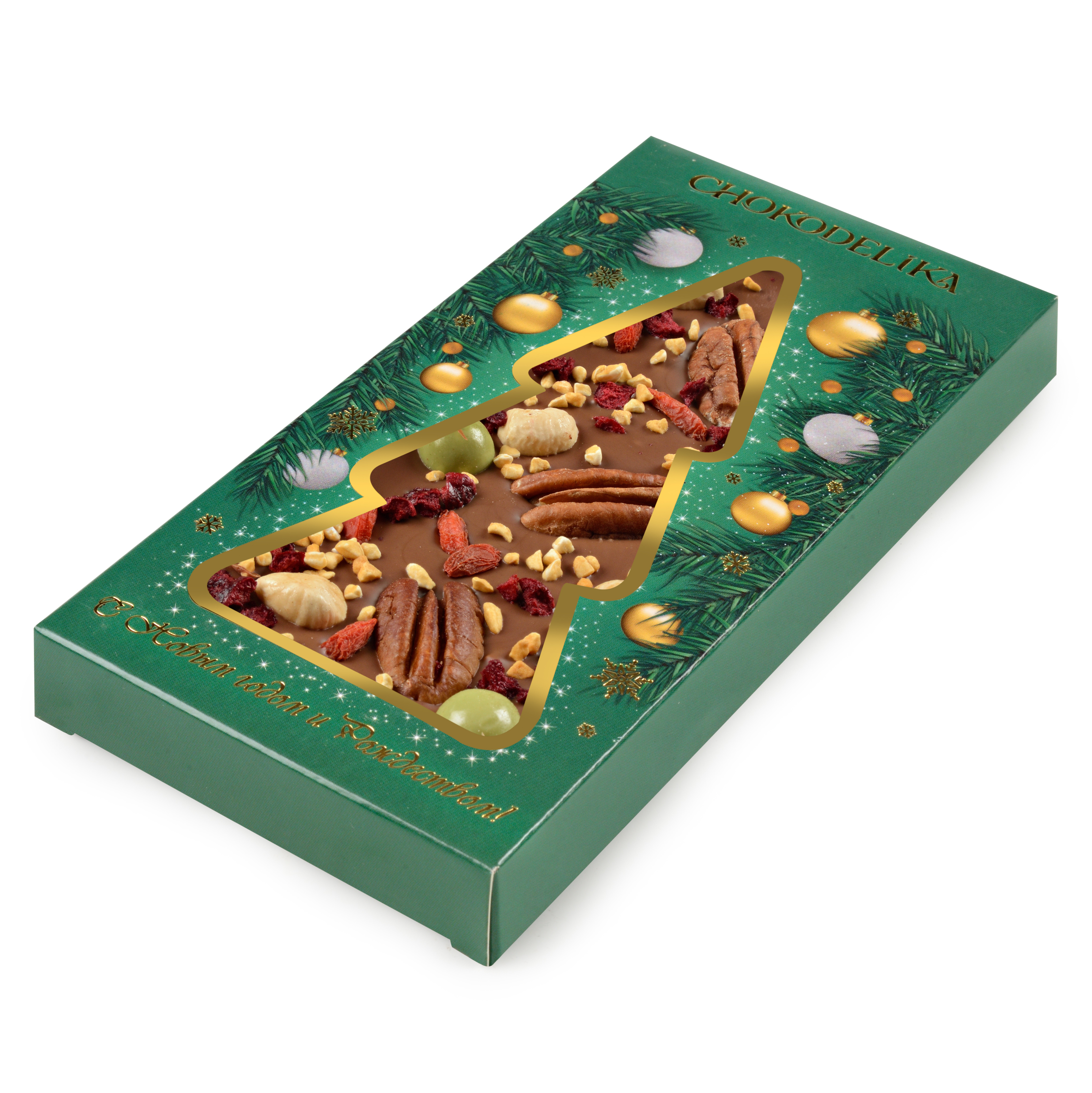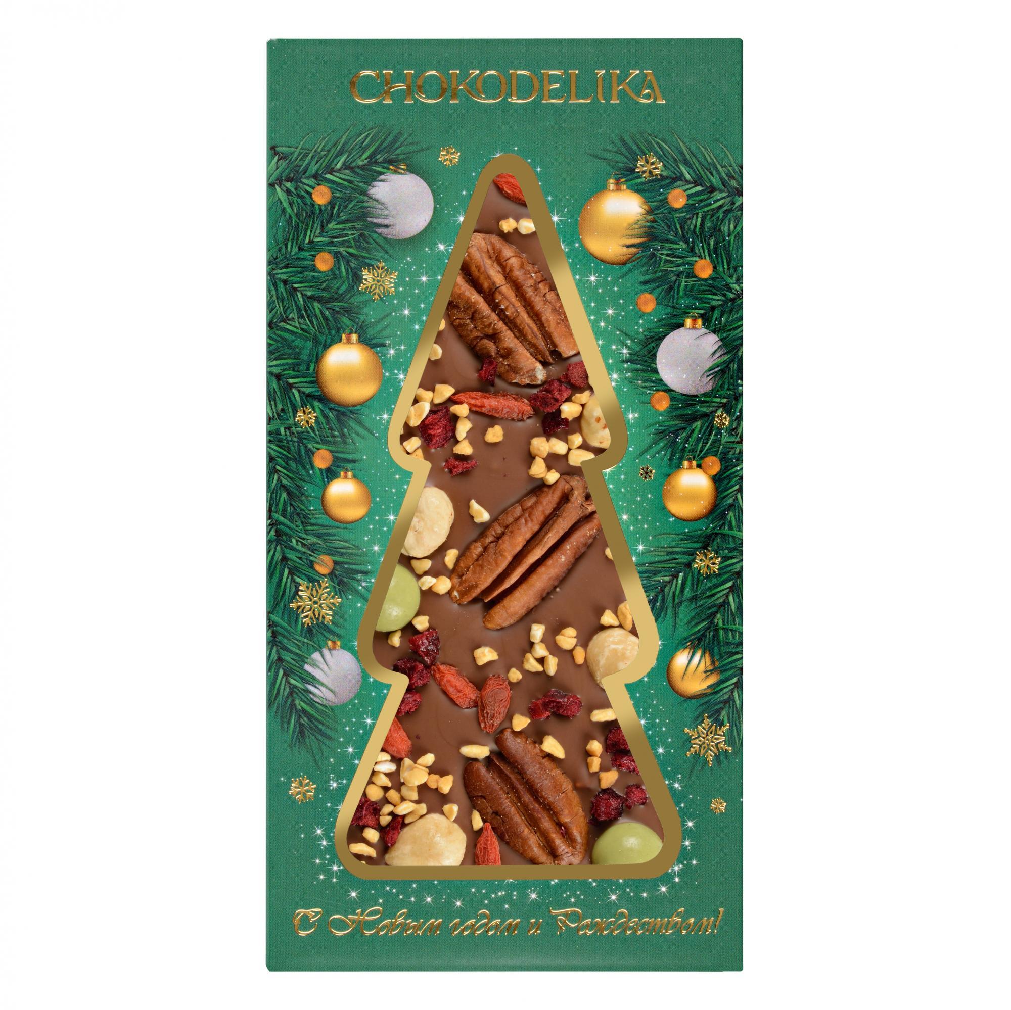 Состав: молочный шоколад, драже хрустящая матча (сахар, масло какао, цельное сухое молоко, эмульгатор: соевый лецитин, натуральный ароматизатор ванильный, зеленый чай, пищевая добавка: «краситель натуральный медные комплексы хлорофиллов», пищевая добавка: краситель натуральный «паприка», пищевая добавка: краситель пищевой натуральный «бета-каротин», шпинат сушеный), пекан обжаренный, фундук обжаренный, ягоды годжи сушеные, воздушный рис в карамели, вишня сушеная, комплексная пищевая добавка: глазирователь «Квик Шайн».