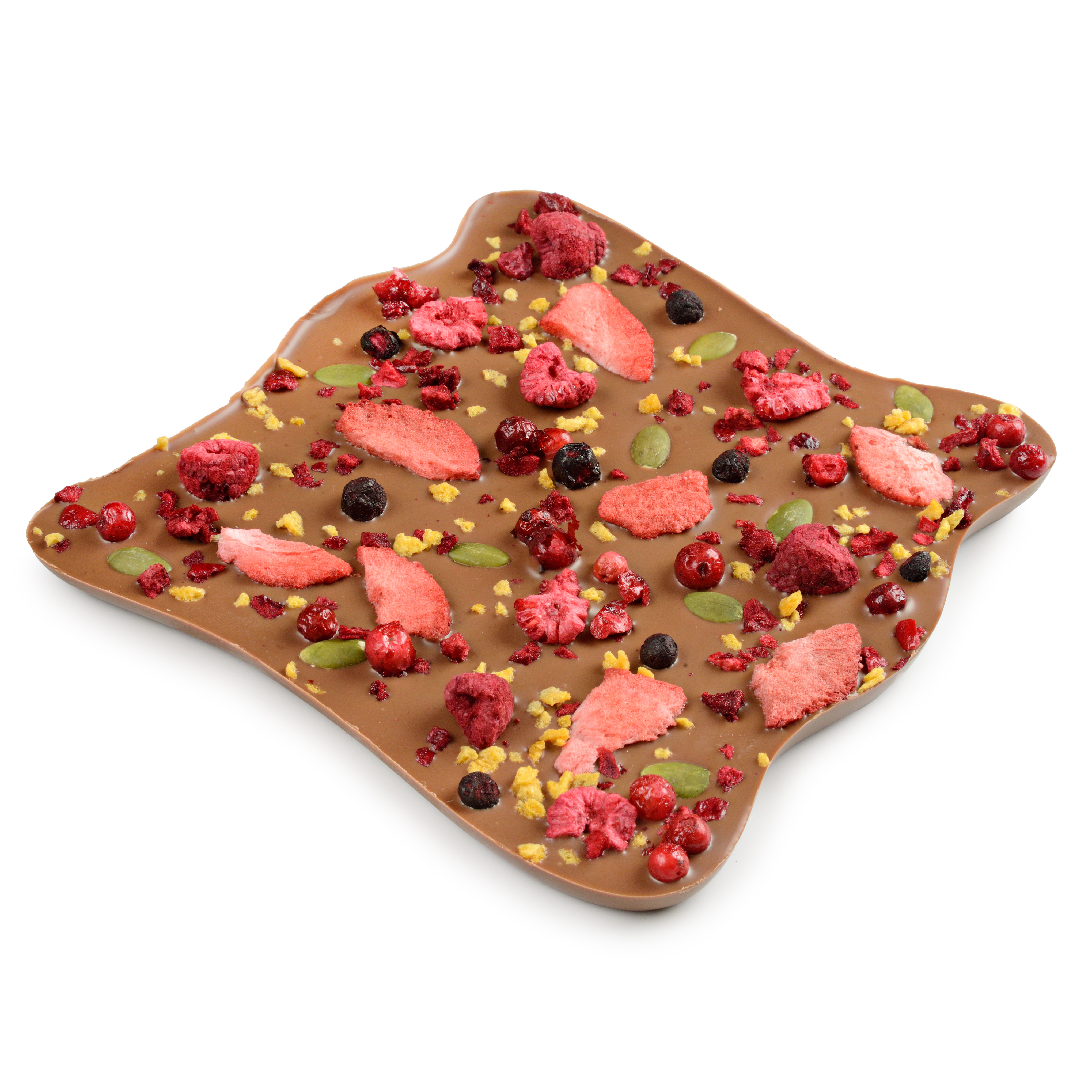 Состав: Молочный шоколад (сахар, масло какао, цельное сухое молоко, эмульгатор: соевый лецитин, натуральный ароматизатор ванильный), ягода сушеная (вишня, клубника, малина, брусника, черника), семена тыквы сушеные, кранчи сушеные "персик" (сахар, персик, крахмал, концентрированный персиковый сок).