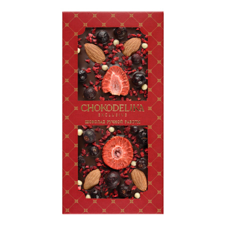 Состав: шоколад темный (какао тертое, сахар, масло какао, эмульгатор: соевый лецитин, натуральный ароматизатор ванильный), миндаль обжаренный, клубника сушеная, черная смородина сушеная, малина сушеная, воздушный рис в белом шоколаде.