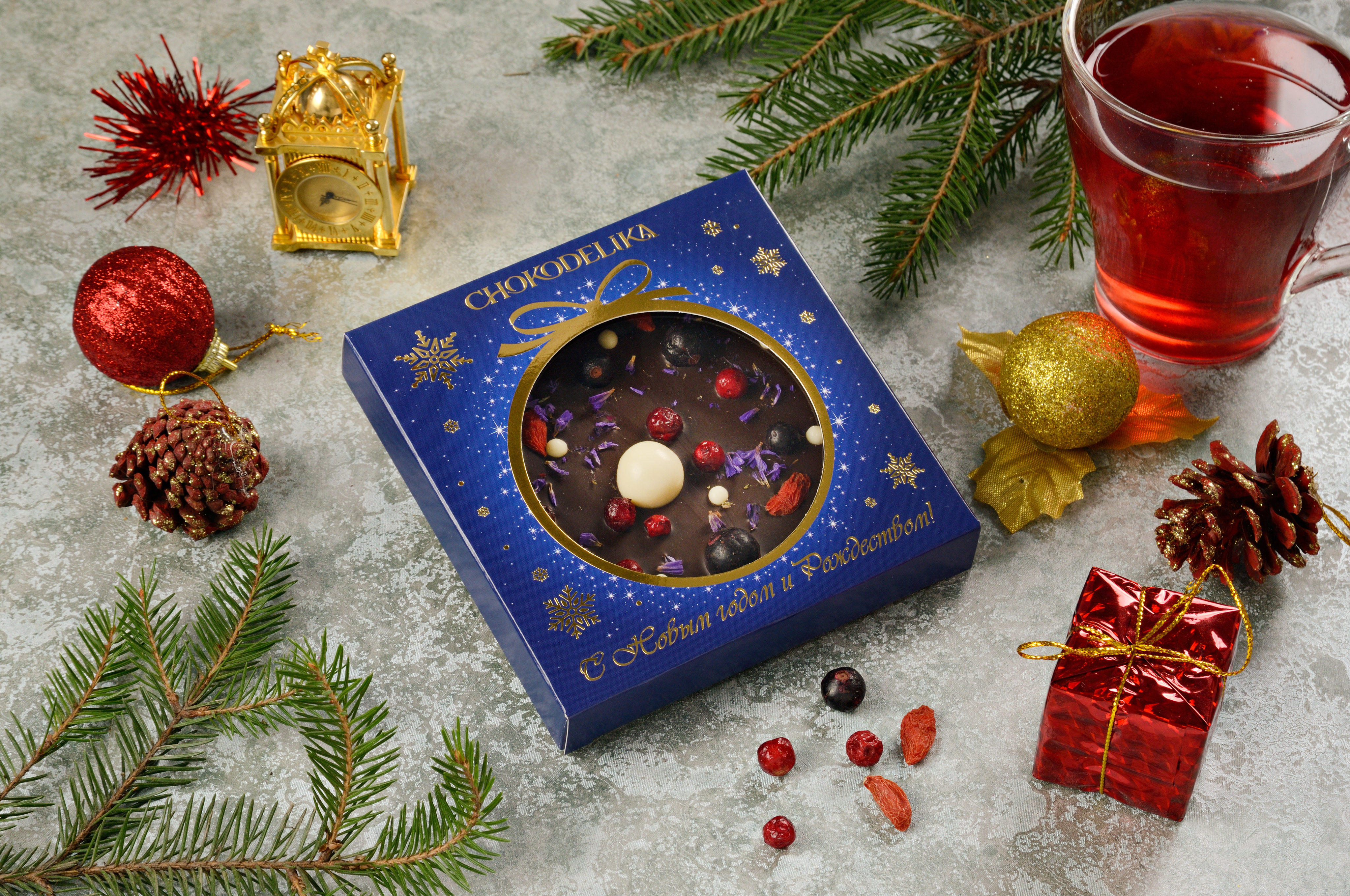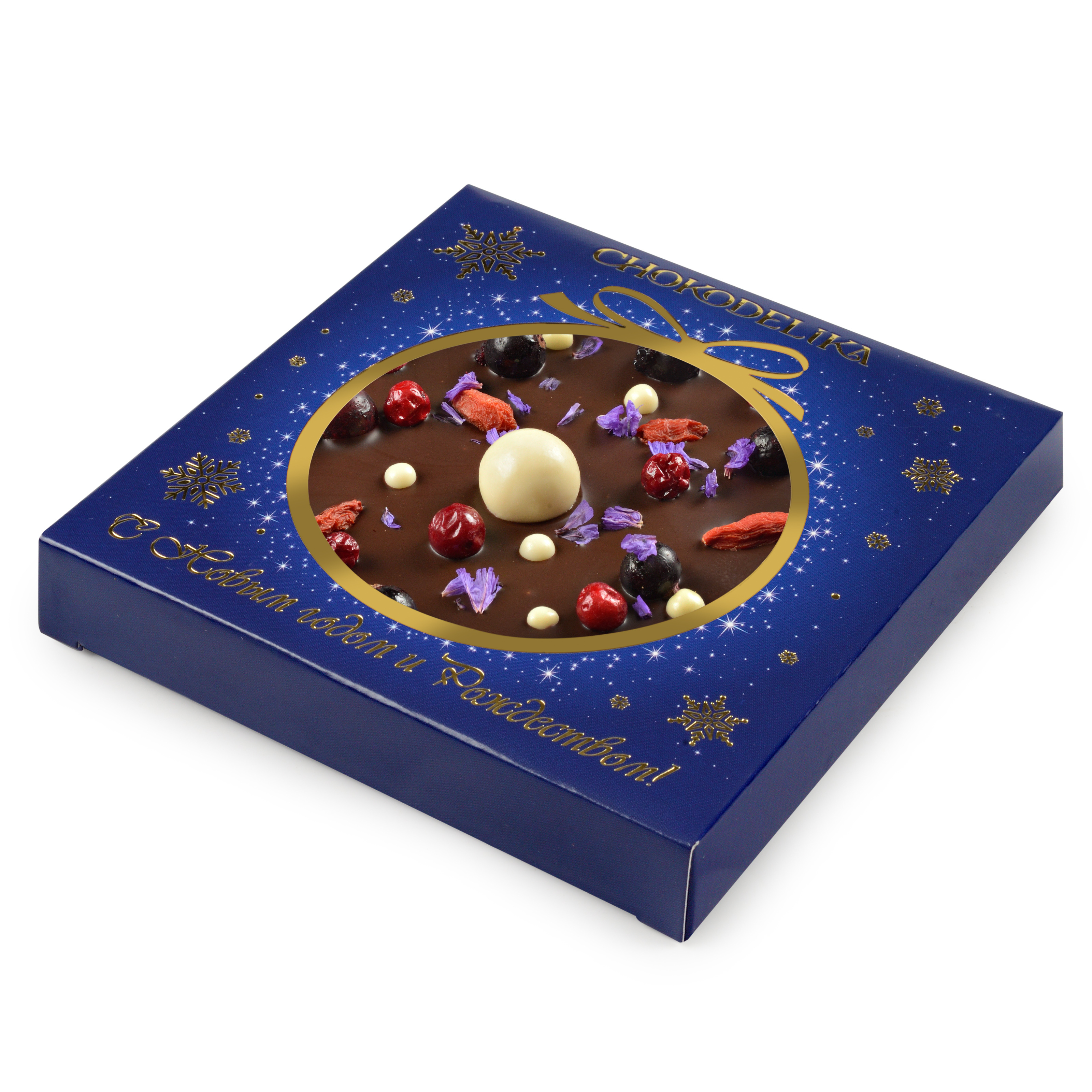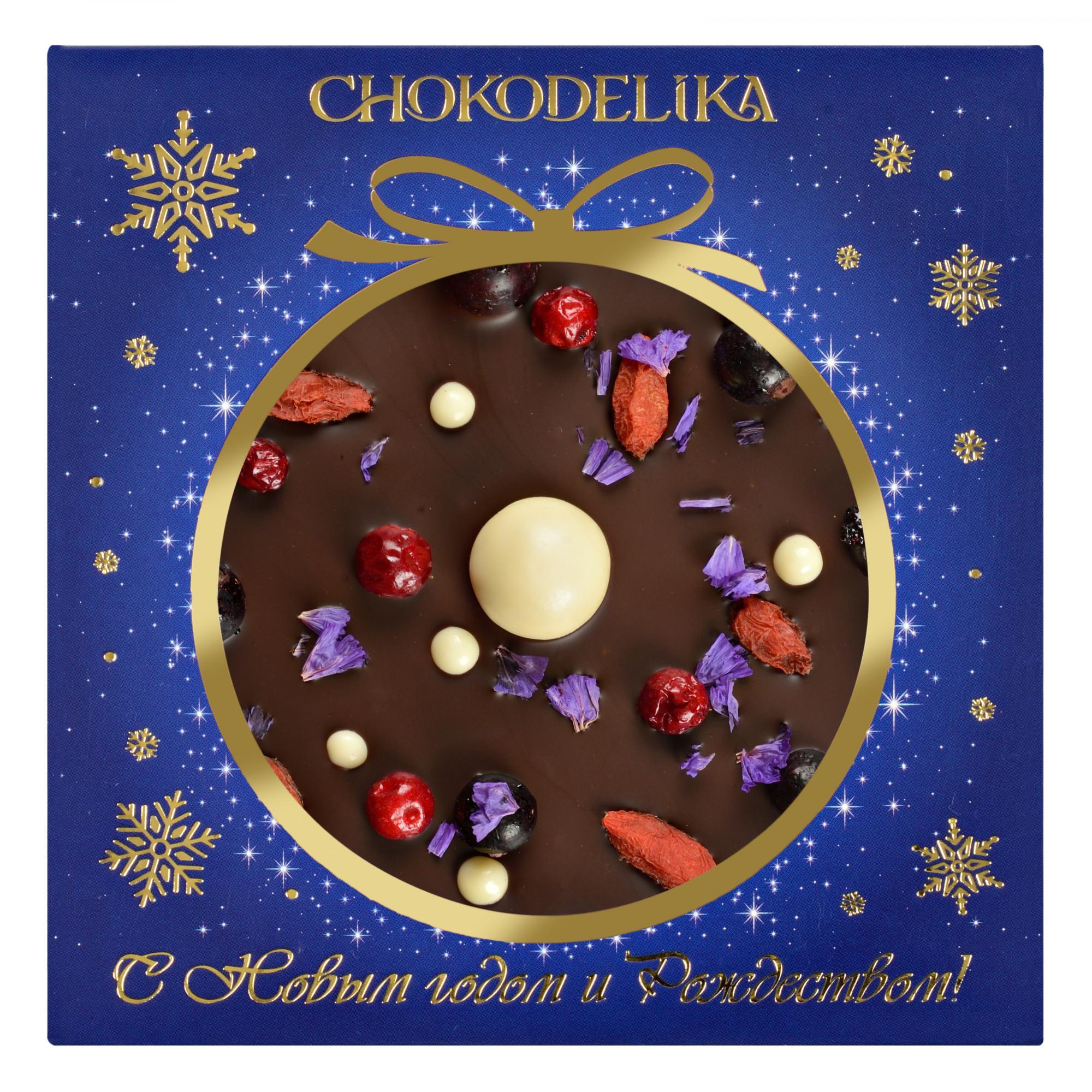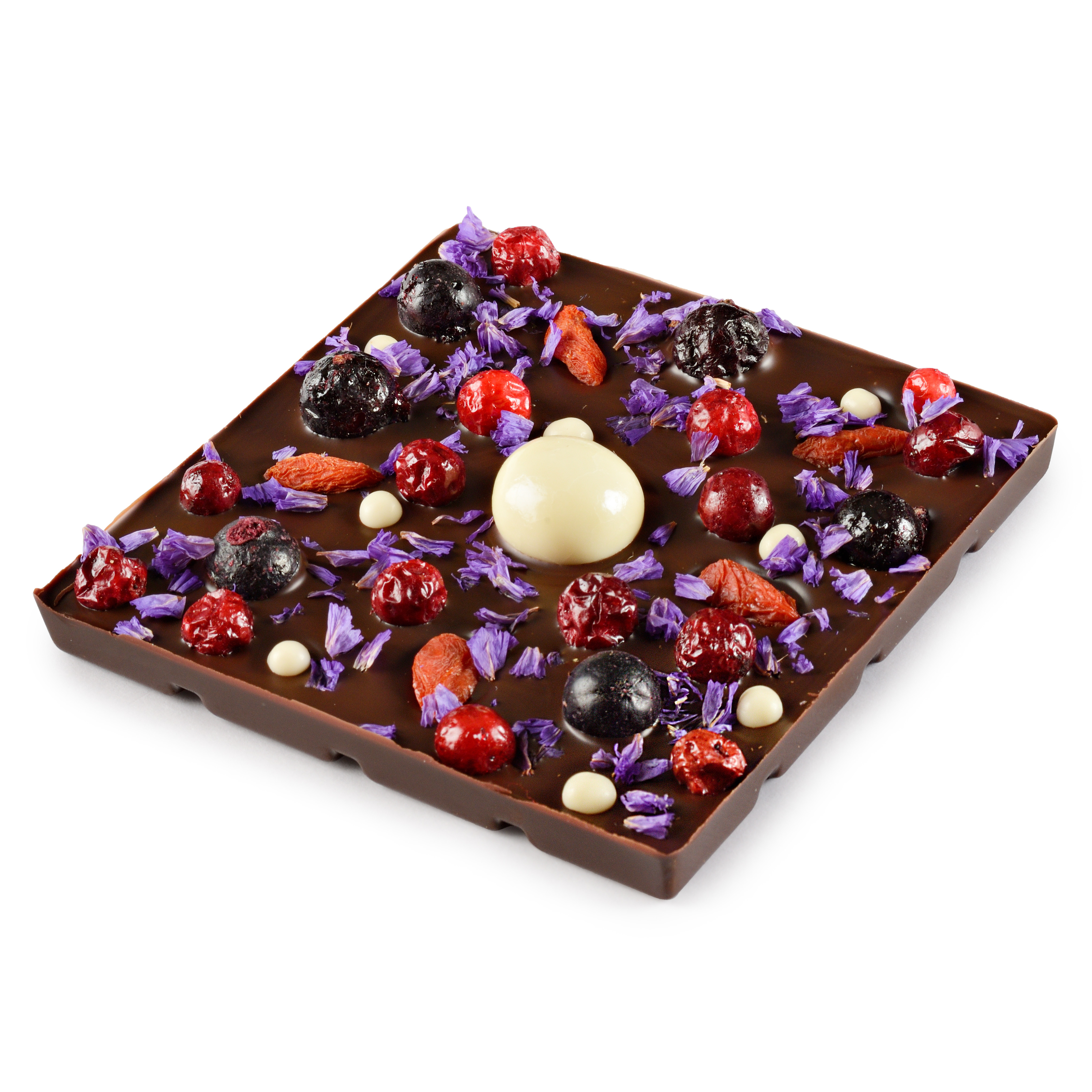 Состав: шоколад темный, фундук в ванильном шоколаде (фундук обжаренный, сахар, масло какао, цельное сухое молоко, эмульгатор: соевый лецитин, натуральный ароматизатор ванильный, комплексная пищевая добавка: глазирователь «Квик Шайн»), черная смородина сушеная, ягоды годжи сушеные, воздушный рис в белом шоколаде, брусника сушеная, лепестки незабудки сушеные.