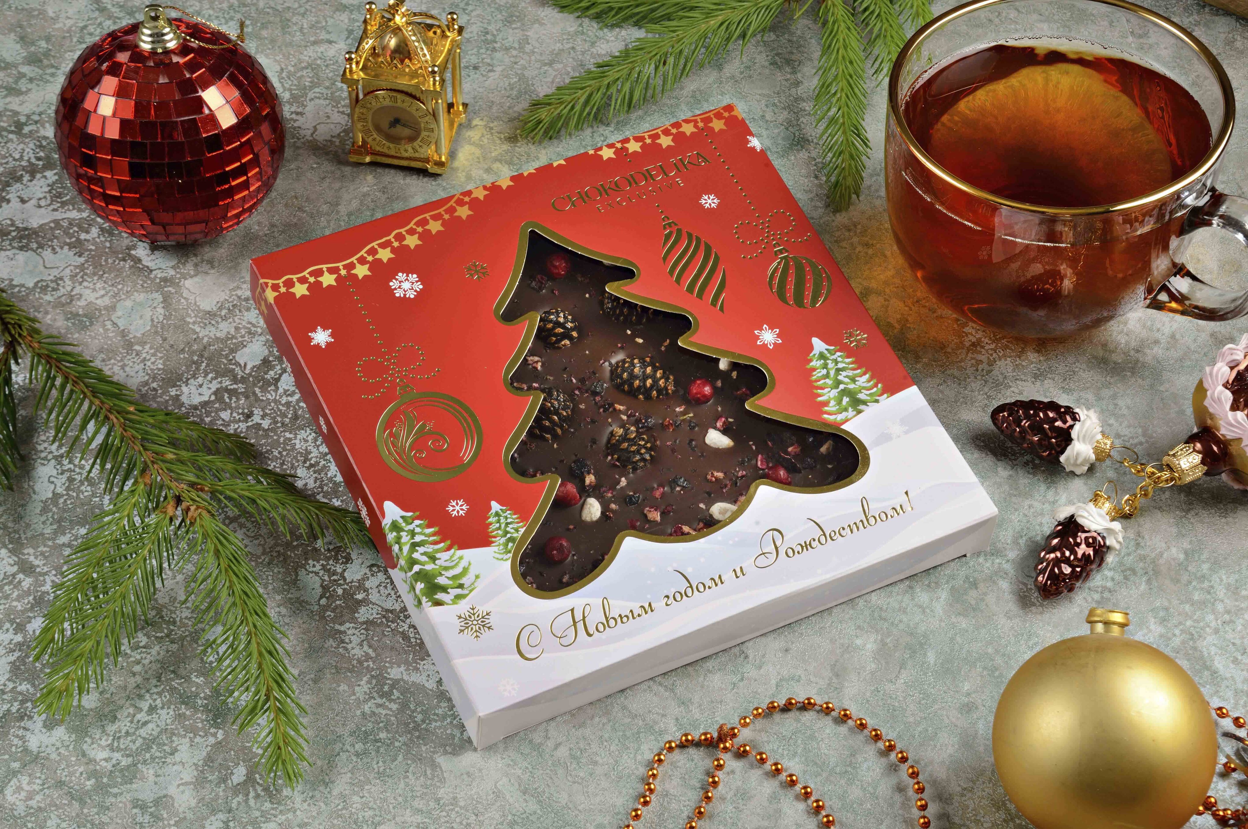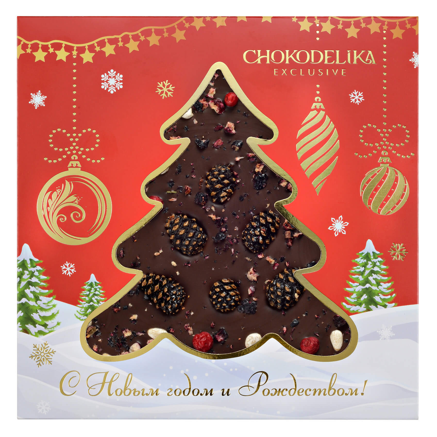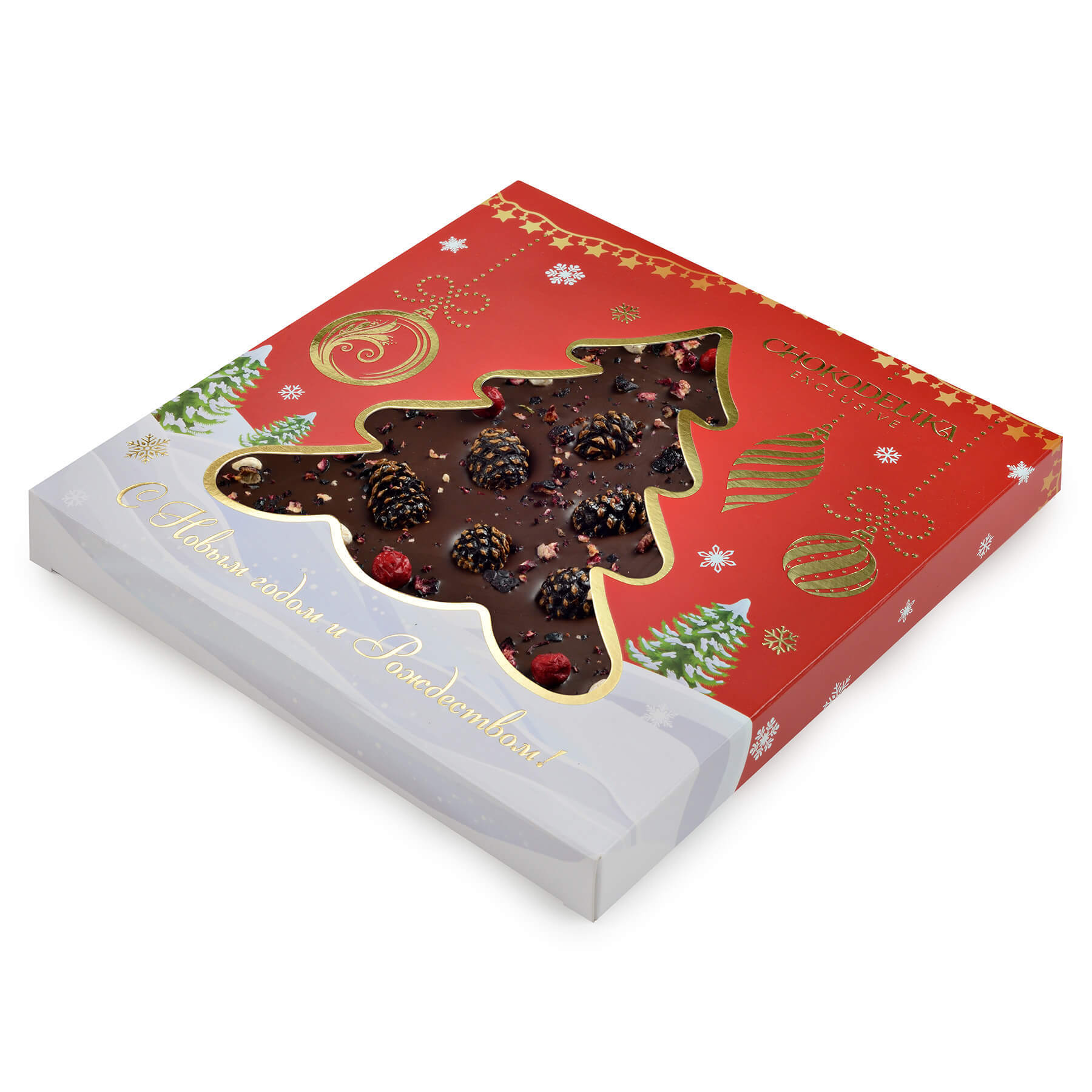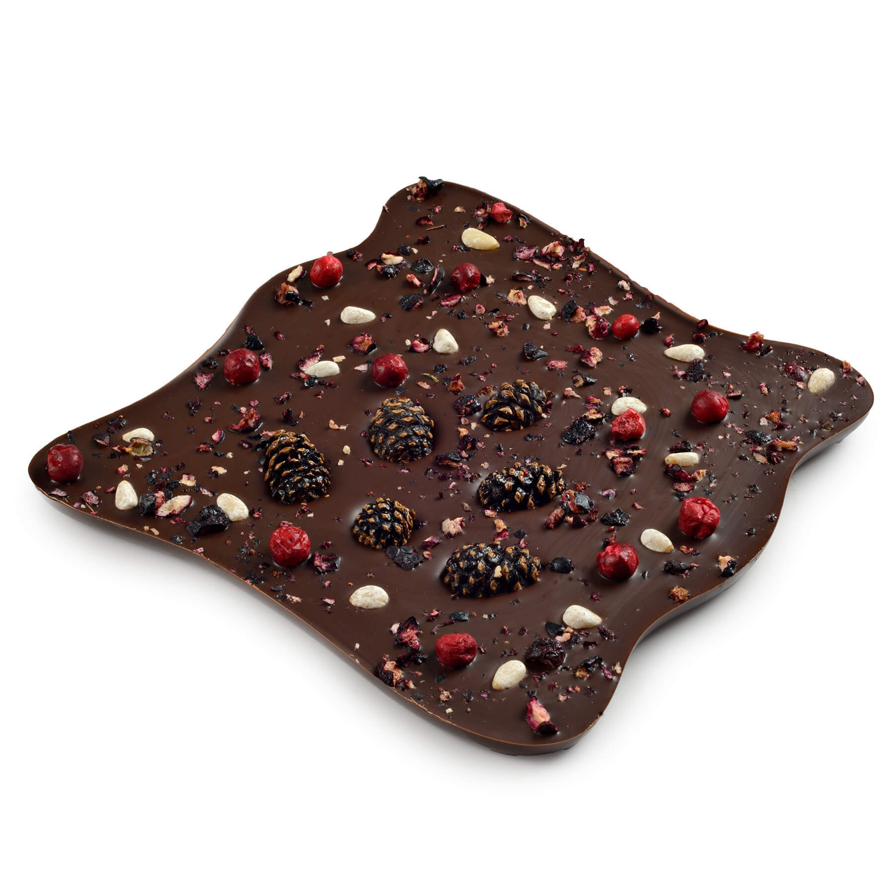 Состав: темный шоколад (какао тертое, сахар, масло какао, эмульгатор: соевый лецитин, натуральный, ароматизатор ванильный), цукаты из сосновых шишек, орех кедровый, шоколад белый (сахар, масло какао, цельное сухое молоко, эмульгатор: соевый лецитин, натуральный ароматизатор ванильный), брусника сушеная, черника сушеная. Пищевая ценность на 100 г продукта: белки – 6 г; жиры – 31 г; углеводы - 55 г. Энергетическая ценность на 100 г продукта: 523 ккал/ 2200 кДж.