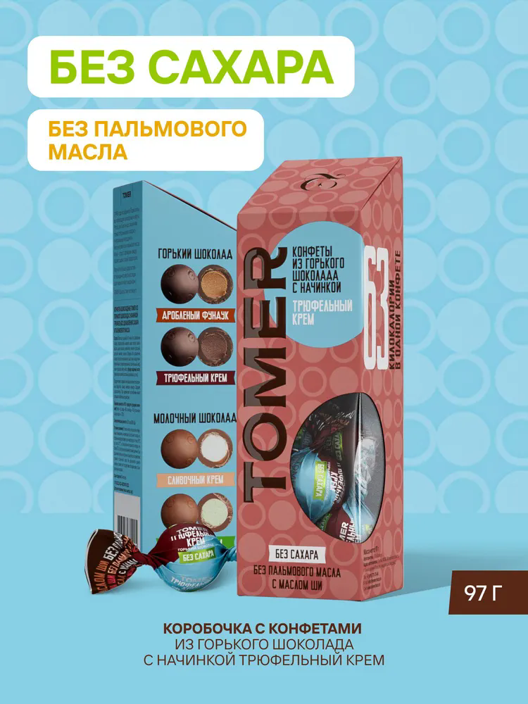 Томер Шоколадные конфеты из горького шоколада с начинкой Трюфель без добавления сахара и пальмового масла , 100гр .